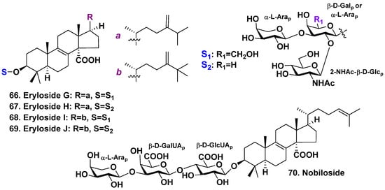 Erylosides G-J (66–69), which are lanostane triosides, were obtained by Shin et al. from the sponge Erylus nobilis. The sponge was collected from shallow waters surrounding Jaeju Island in Korea [41]. The lanostane aglycones possess an 8(9)-double bond, C-14 carboxyl, and 24-methylene in the side chains (Figure 5). Glycosides 68 and 69 also possess an additional methyl at C-25 position, similarly to the glycosides from E. goffrilleri. Triterpene glycosides 66–69 are triosides that exhibit moderate cytotoxic activity against the human leukemia cell line K562, with IC50 values of 22.1, 24.8, 17.9, and 21.8 μg/mL, respectively [41].