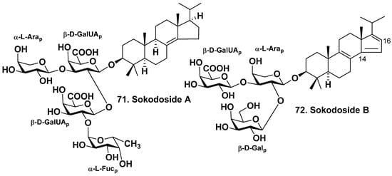 Okada et al. have found two unique 14-nor-methyl-23,24,25,26,27-pentanorlanostane glycosides in Erylus placenta harvested near the shores of the South Japan (Hachijo Island). An unprecedented sokodoside A (71) aglycone possesses an 8(14)-double bond. However, sokodoside B (72) has an unprecedented conjugated 8(9),14(15),16(17)-triene system [43] (Figure 6). Sokodoside 71 is a branched tetraoside. The first monosaccharide residue of 71 is β-D-galacturonic acid, the second sugar linked to C-2 of the first monosaccharide residue is also β-D-galacturonic acid, and the terminal (third) one linked to C-2 of the second monosaccharide residue is α-L-fucose. Another terminal monosaccharide is α-L-arabinose residue. Sokodoside B (72) is a branched trioside that has carbohydrate moiety including α-L-arabinose, β-D-galactose and β-D-galacturonic acid. The arabinose residues configuration was erroneously determined as β. However, the presented coupling constant in the 1H NMR spectra of 71 and 72 demonstrated an α-configuration. A synthesis of the trisaccharide carbohydrate chain of sokodoside B has been realized by thioglycoside activation using sulfuric acid immobilized on silica in conjunction with N-iodosuccinimide [59]. The glycosides 71 and 72 revealed moderate growth-inhibitory activity on the fungus Mortierella ramanniana and several strains of the yeast Saccharomyces cerevisiae with or without mutations (cdc28, erg6 and act1-1). The size of inhibition zones was varied from 8 to 16 mm at 50 μg of the tested glycoside on 6 mm spot on thin paper disk. The glycoside 71 was more active than 72. Glycosides 71 and 72 reveal moderate cytotoxic effects on P388 cells with IC50 of 100 and 50 μg/mL, respectively. The correlation between their antifungal and cytotoxic activities was observed [43].