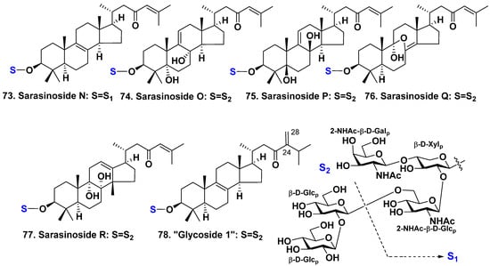All the aglycones of 73–77 are 14-nor-lanostane derivatives having a 23-ketone and a 24(25)-double bond in the side chain. The aglycone of 73 has an 8(9)-double bond whereas aglycones of 74 and 75 possess a 9(11)-double bond. Aglycone of 74 has additional 5α- and 8α-hydroxyls whereas aglycon of 75 possess 5β- and 8β-hydroxyls. The aglycone of 76 has an 8(14)-double bond and 9α-hydroxy and 8(9)-epoxy groups. The aglycone of 77 has 8α,9α-diol group and C-18 methyl shifted to 14β-position. It also has a unique 12(13)-double bond. Most of these glycosides feature a pentasaccharide chain that is very typical of sarasinosides. However, glycoside 73 is unique in that it is a trioside lacking two glucose residues, specifically the terminal and pre-terminal ones [44].