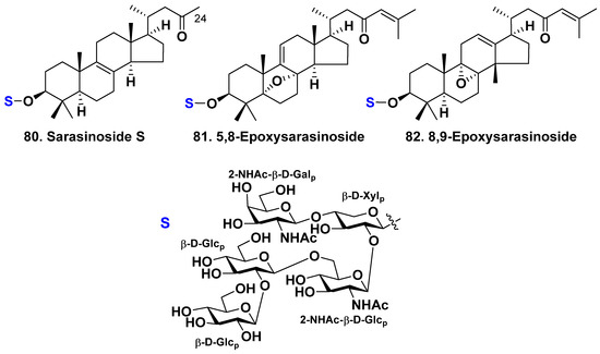 Two more glycosides with a similar carbohydrate chain, named as 5,8-epoxysarasinoside (81) and 8,9-epoxysarasinoside (82), with known sarasinosides A1 (1) [13,16], H1 (14), I1 (16), I2 (17) [18], O–R (74–77) [38] were isolated recently from the marine sponge Petrosia nigricans [48]. Glycoside 81 possesses an epoxy group at positions 5 and 8, whereas glycoside 82 possesses an epoxy group at positions 8 and 9. Furthermore, compound 81 has a double bond at position 9(11), whereas compound 82 has a double bond at position 12(13) and a methyl group at position 14β instead of a methyl at position 18, similar to sarasinoside R (77). Glycosides 81 and 82 have shown low cytotoxicity against human colon cancer HCT116 and lung cancer A549 cell lines [48].