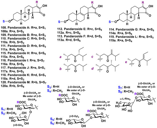 Pandarosides 108–120 and their methyl esters 108a, 110a–120a from Pandaros acanthifolium.