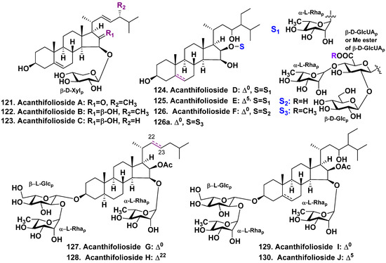 It is interesting that all the triterpene glycosides found in E. formosus (totally 20 glycosides) have similar structural features. All the glycosides contain α-L-arabinopyranose as the first sugar linked to an aglycone C-3 position. The number of sugars may vary from two to six.