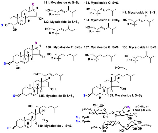 - Antonov, A.S.; Afiyatullov, S.S.; Kalinovsky, A.I.; Ponomarenko, L.P.; Dmitrenok, P.S.; Aminin, D.L.; Stonik, V.A. Mycalosides B–J, eight new spermostatic steroid oligoglycosides from the sponge Mycale laxissima. J. Nat. Prod. 2003, 66, 1082–1088. [Google Scholar] [CrossRef]