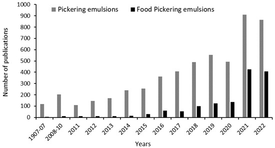 The search for solid particles compatible with food applications has gained an increased interest in the past few years, as evidenced by the large number of scientific publications in the field (Figure 1). PEs provide a way to develop functional emulsions with biocompatible solid particles [13,14] and enhanced chemical stability [15,16,17], enabling products with an emulsifier-free label [18]. In this context, PEs based on inorganic solid particles can be the basis of new alternative (e.g., vegan) functional and stable products, avoiding petroleum-based additives, and complying with cruelty-free practices, among others, responding to current lifestyle trends. Other applications have also increased, indicating PEs’ suitability for areas such as pharmaceuticals and cosmetics [19], oil recovery [3] and catalysis [20]. Thus, inorganic solid particles can have widespread use in emulsion stabilisation, conferring interesting characteristics on the final product.