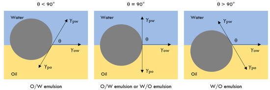 Solid particle wettability is characterised by the three-phase contact angle () [7,28,32], which results from the balance of the interfacial tensions at the water–oil, particle–water and particle–oil interfaces, expressed by Young’s equation (Equation (2)).