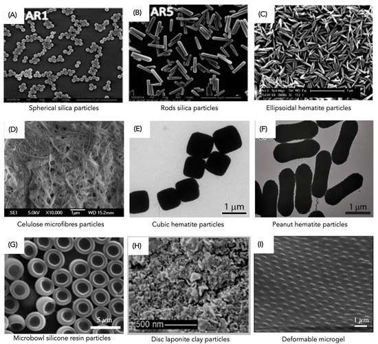 Considering particle shape, stabilisation performance was mostly studied for spherical particles and many models were developed based on this morphology, e.g., desorption energy (Equation (1)) [24]. However, most solid particles used are not spheric, resulting also in effective solutions for the stabilisation of O/W or W/O PEs. For example, rod-shaped [31], ellipsoidal [61], fibre-like [62], cubic [63], peanut-shaped [63], microbowl-like [64], disc [65] and deformable gel [66] are among the reported typical non-spherical particles (Figure 3). In the food industry, particle shape is an important factor since food-grade or food-compatible particles usually have an irregular or anisotropic shape; thus, their impact on PE stabilisation is worthy of assessment [61].