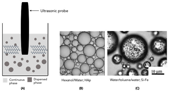 Ultrasonic technology is another method used to produce PEs, where the ultrasonic probe is the most commonly used configuration [2]. It consists of a titanium probe that vibrates due to a transducer containing a piezoelectric crystal, which converts electric energy to very high-frequency mechanical motion (Figure 5A). The probe transmits ultrasonic energy to the surrounding sample, inducing emulsification mainly through cavitation and turbulent effects [1,2]. Ultrasonic devices use high power to interact with the materials; however, in PEs, which use sensitive particles, the use of ultrasonic homogenisers requires some caution, since they can expose the emulsion to high-intensity ultrasound power [1] as well as to local high temperatures [148], promoting physical and/or chemical degradation of the particles [1]. For PE production, the emulsions are subjected to amplitudes that range from tens to hundreds of watts and a few minutes are usually applied to prepare the emulsion. In general, these are the main parameters affecting emulsion droplet size, and the use of optimised parameters can lead to the minimum droplet size. However, it is important to point out that the optimal parameters strongly depend on the system composition, requiring a well-planned experimental design.