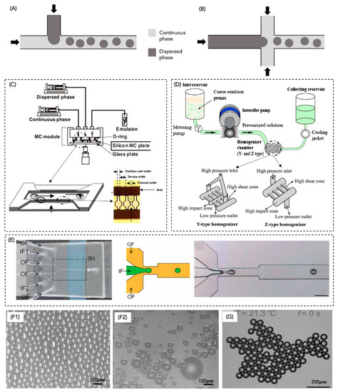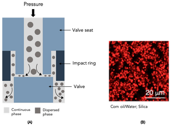 High-pressure homogenisers are the most common devices used in the food industry to prepare CEs [1]; however, according to Table 1 and Table 2, this homogeniser is seldom used in PE preparation. Before using this homogenisation technique, it is recommended to obtain a coarse emulsion [1]. A schematic diagram of a high-pressure homogeniser is shown in Figure 6A.