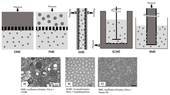The process by which two immiscible liquids are converted into an emulsion is known as emulsification, while homogenisation is the act that makes emulsion droplets uniformly distributed. Emulsification and the subsequent homogenisation are usually carried out using mechanical devices known as homogenisers [1]. The production of emulsions requires external mechanical energy to break up the dispersed phase into small droplets, homogenising this phase throughout the continuous phase [147]. The most common types of equipment to prepare PEs are high-shear mixers and high-pressure and ultrasonic homogenisers (see Table 1 and Table 2). These types of devices allow the preparation of small amounts of PEs, and, subsequently, the production is often performed in batch mode. However, techniques such as membrane homogenisers and microfluidisers have been applied to prepare PEs. A brief description of each technique is given next.
