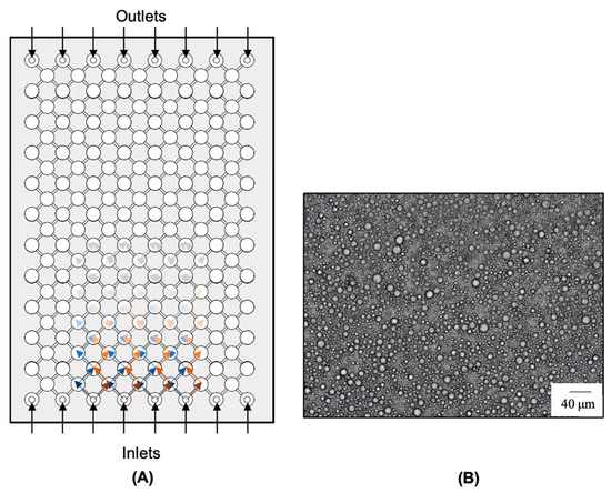 High-shear mixers, which are a type of rotor-stator device, are the most used devices for homogenising oil and aqueous phases [1]. In PE production, this device is the most used [2]. It consists of a rotor and stator with blades and openings, respectively; usually, the emulsification takes place in a suitable container (Figure 4A). When the rotor rotates, a depression is created, drawing the liquid in and out, resulting in liquid circulation [2]. The shear force between the rotor and stator and the high liquid acceleration causes the droplet size reduction of the dispersed phase [2]. For PE production, the oil and water phases can be added at the beginning or added sequentially to improve the emulsification in terms of the droplet size [1,2].