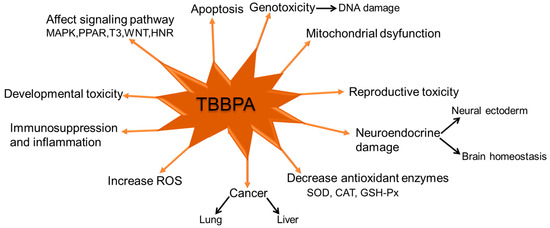 TBBPA triggered significant metabolic alterations in human hepatoma cells [98]. Liver disease and liver damage are often caused by TBBPA. There is enough evidence to prove that respiratory problems like lung diseases and pulmonary fibrosis are triggered by TBBPA exposure, even though the epidemiology of TBBPA on the respiratory system lacks clarity [99]. The production of reactive oxygen species and osteoblast apoptosis can be activated by TBBPA, which can lead to diseases of the bones [100]. A graphical illustration of the toxic effects of TBBPA is shown in Figure 1.