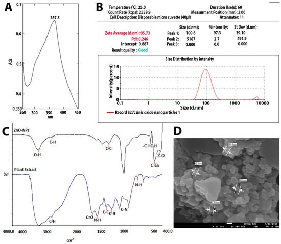Based on a method created by Elsayim and others, zinc oxide nanoparticles were synthesized by mixing 20 grams of Acacia nilotica fruits with 150 mL of distilled water (DW), boiling the solution 80 °C for 2 h, and then filtered the aqueous mixture. Subsequently, we added 5 gm of zinc nitrate obtained from Sigma-Aldrich Co. (Budapest, Hungary) to 100 mL of the aqueous extract of A. nilotica and boiled the mixture until the color changed to a deep brownish yellow paste. The zinc nitrate and aqueous extract mixture was kept. at 60 °C for 24 h, resulting in a dark brown spongy paste. Finally, the spongy paste was formed and packed before being transferred to a muffle furnace at 400 °C for 2 h to obtain white powder of pure ZnO-NPs [6]. After ZnO-NPs formed, we tested their formation by using UV-Vis spectroscopy (UV-1800; Shimadzu UV Spectrophotometer, Kayoto, Japan). Size and stability of ZnO-NPs were measured by dynamic light scattering measurement, performed with a Malvern Zetasizer Nano series compact scattering spectrometer (Malvern Instruments Ltd., Malvern, UK). The shape, structure, and distribution of the synthesized nanoparticles were examined by SEM (JEOL model, JSM-761OF, Tokyo, Japan). Fourier-transform infrared spectroscopy (FTIR), in the range of 400–4000 cm−1 (Parkin Elmer, Spectrum BX, Waltham, UK) was used to study the different functional groups present in the aqueous plant extract and ZnO-NPs.