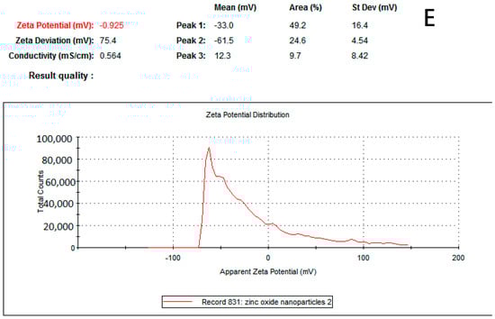 (A) UV-visible spectrum of ZnO-NPs. (B) Zetasizer of ZnO-NPs. (C) FTIR of ZnO-NPs. (D) SEM of ZnO-NPs and (E) zeta potential of ZnO-NPs.