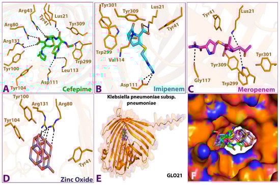 As shown in Figure 2, the 3D docking program detected that all ligands interacted with porin protein by docking in the same binding pocket cavity comprising common amino acid residues. Zinc Oxide expressed four hydrogen-bonding interactions with residues ARG 131, ARG 80, TRY 100, and TRY 116, while six hydrogen bonds were observed between cefepime and ARG 131, ARG 80, ARG 43, LUS 21, ASP 111, and LEU 113 residues. Imipenem was shown to establish four hydrogen-bonding interactions with the residues LUS 21, VAL 114, and ASP 111. The final ligand, meropenem, presented three hydrogen bonds with the residues LUS 21, GLY 117, and TRP 299. This indicates that these amino acid residues are necessary for target binding and that they exert activity [22]. A favorable and stable binding position of the compounds within the binding pocket of the target protein is indicated by extremely low energy scores [21,23]. The best binding free energy scores for the four selected compounds show that the highest binding affinity for porin was Zno (−9.1 kcal/mol), followed by cefepime (−7.9 kcal/mol), meropenem (−7.5 kcal/mol), and imipenem (−6.4 kcal/mol). A strong binding property may be induced by the ionic bond, which facilitates enzyme binding. In addition, the aromatic ring, through numerous interaction bonds—including hydrogen, hydrophobic, and ionic bonds—contributes to its great binding affinity with porin protein. Interestingly, with comparable conformations, glide docking scores, and relatively similar binding energies, all four hits fit into the target-binding pocket and interacted with the GLO21 protein similarly; the details of the interactions are presented in Table 2.