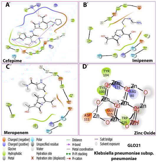 Interactions between the four compounds: (A,A’) Cefepime, (B,B’) Imipenem, (C,C’) Meropenem, and (D,D’) Zinc Oxide, and the target protein GLO21. (E) interaction shape showing all compounds and (F) binding cavity of the protein showing all compounds, presented in 3D (A–E) and 2D (A’–D’) shapes.