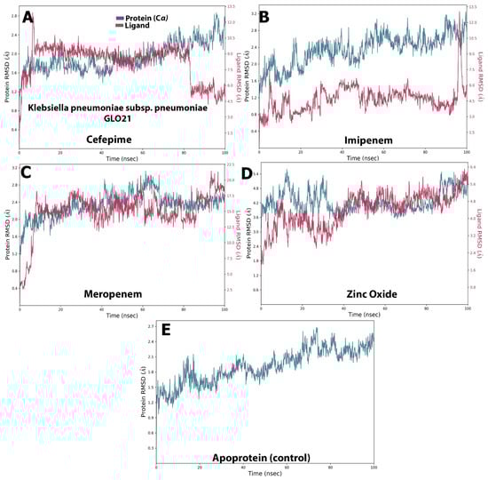 The selected compounds’ protein–ligand RMSD over 100 ns. (A) Cefepime, (B) imipenem, (C) meropenem, (D) zinc oxide, (E) apo-form as a control.