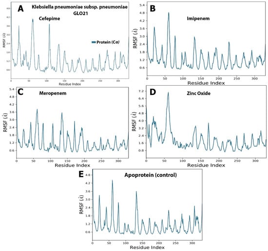 The selected compounds’ protein–ligand RMSF over 100 ns. (A) Cefepime, (B) imipenem, (C) meropenem, (D) zinc oxide, (E) apo-form as a control.