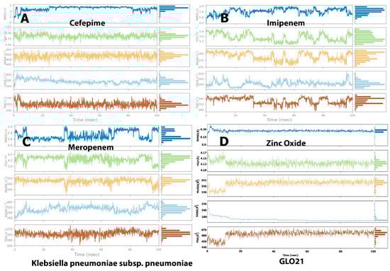 The molecular surface area (MolSA), radius of gyration (rGyr), polar surface area (PSA), and solvent-accessible surface area (SASA) values, which reveal information on the behavior of the ligand inside the binding pocket of the GLO21 protein, were calculated to evaluate the ligand’s properties. The RMSD representation is mostly used for protein stability analysis and conformational change prediction in proteins, which leads to the prediction of structural stability [23]. The RMSD values of cefepime and Zinc Oxide primarily fluctuated very early, at 3 ns, and their complex with GLO21 appeared in the ranges from 1.00 Å to 3.00 and 0.2–0.4 Å, respectively. Alternatively, meropenem and imipenem fluctuated at 10 ns and the RMSD values for both were 0.5–2.4 (Figure 5). Although Zinc Oxide displayed the most interesting aspect on this graph, with the best binding pose (less than 2 Å) [20,23]. there was no certainty that the binding to GLO21 was occurring within the candidate protein’s catalytic binding pocket. Therefore, RMSD value was not sufficient to determine the superior binding configuration. Additionally, it was discovered that contact-based analysis of the radius of gyration (rGyr), another parameter, is more reliable and appropriate, as it reflects the protein structure’s compactness [26]. Zinc Oxide and cefepime exhibited slight fluctuation within an acceptable range, and then they steadily reached stability. Alternatively, meropenem and imipenem showed irregular fluctuations, results typical of an unstable protein. The protein was kept compact and folded gradually during the simulation path, based on the steady value of rGyr (Figure 6). On the other hand, cefepime’s greatest MolSA value (400–424 Å2) occurred with less fluctuations, while Zinc Oxide and meropenem showed moderate MolSAs (3530–350 Å2) with moderate fluctuations. Imipenem demonstrated the lowest MolSA (225–282 Å2) with the widest fluctuations. The SASA values of the fourth ligand were assessed, presenting variable results among the candidate ligands. Zinc Oxide was measured as the most constant compound (160–320 Å2, with equilibrium at 150 Å2). Imipenem had a similar SASA to Zinc Oxide (160–320 Å2), but its equilibrium was at 200 Å2. Cefepime and meropenem exhibited convergent SASA results (200–450 Å2 and 160–400 Å2, respectively, with equilibrium at 300 Å2 for both). Another important value during the simulation of all tested compounds was PSA, which was measured as 460, 220, and 200 Å2 in cefepime, imipenem, and meropenem, respectively. The finding of Zinc oxide’s PSA was also reported by Hendi and others [27]. Interestingly, the Zinc Oxide ligand displayed the best PSA value, confirming the potential of ZnO as an antibacterial drug. This result was supported by the findings of Mugumbate and Overington, who reported that “more polar compounds are a key part of successful future antibacterial discovery” [28].