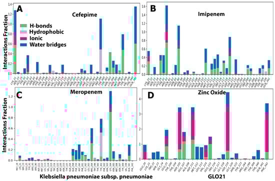 Throughout the simulation, interactions between the GLO21 protein and the candidate ligands were observed. The protein–ligand contacts involved hydrophobic bonds, hydrogen bonds, ionic bond, and water bridges. In our results, the most common bond among the four tested compounds was the hydrogen bond, which performs a critical role in protein binding to ligands. An ionic bond was observed mostly with Zinc Oxide. Hendi and others found that only Zinc Oxide presented ionic bond when in contact with SARS-CoV-2 vital proteins [27,29]. For cefepime, the protein–ligand interaction involved hydrogen bonding with 14 residues: SER23, TYR41, ARG80, ARG43, ASP191, GLN258, GLY262, TRP299, TYR301, LYS304, ASN305, ASN307, VAL339, and GIN341 (Figure 6A). For Zinc Oxide, the H-bonds were formed with 18 residues: GLU20, TRP22, SER23, GLY24, GLU25, ASP105, GLU107, TYR340, PHE342, ASP111, MET112, LEU113, VAL114, GLU115, GLY118, ASP119, ASN122, and TYR309 (Figure 6D). Our Zinc oxide–GLO21 complex possessed more residues than those reported by Hendi and others, and the reason behind this variable finding could be due to the protein’s type [20,23]. The third compound (meropenem) constructed the hydrogen bond with 13 residues: NET19, TYR41, ARG43, GLN256, GLN258, ASP260, ARG264, TYR301, LYS304, ASN305, ASN307, and GLN341 (Figure 6C). Imipenem presented hydrogen bonding contact with the largest number of residues, including: LYS21, SER23, GLU25, TYR41, ARG43, ASN65, ARG80, TYR100, TYR104, ASP111, LEU113, VAL114, GLU115, TRP116, GLY117, GLY118, ASP119, ARG131, TRP299, TYR301, ASN307, TYR309, and GLN341 (Figure 6B). Zinc Oxide showed ionic bonding contact with the protein with the following nine residues: GLU20, GLU25, GLU107, ASP105, ASP111, VAL114, GLU115, ASP119, and PHE342. The remainder of the tested compounds had no significant number of ionic bonds. The hydrophobic bond appeared only in the interaction between cefepime, meropenem, and imipenem with ARG264, TYR301, and TYR309, respectively.