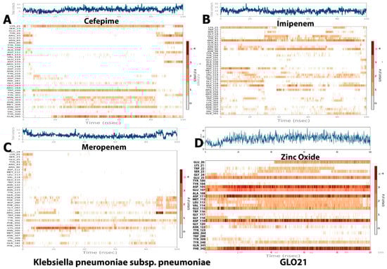 Ligand–protein contact plot for compounds/GLO21 complexes during simulation trajectory. (A) Cefapime, (B) Imipenem, (C) Meropenem and (D) Zinc Oxide.