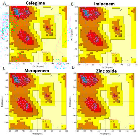 Ramachandran plot of protein interacting with the four selected compounds. (A) Cefepime, (B) imipenem, (C) meropenem, (D) zinc oxide.
