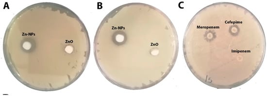 (A) Zone of inhibition of ZnO-NPs against Klebsiella pneumoniae (ATCC 700603) at concentrations of 7.5 mg/mL. (B) Zone of inhibition of ZnO-NPs against KPC at concentrations of 7.5 mg/mL. (C) Zone of inhibition of cefepime, meropenem and imipenem discs against KPC.