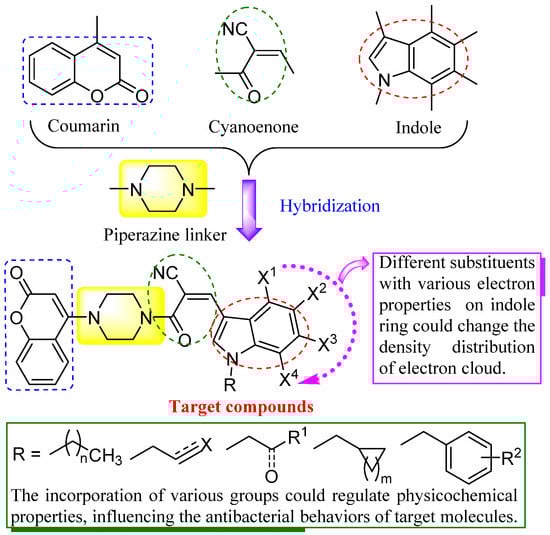 The incorporation of different pharmacophores in a molecular framework is beneficial to increase the action sites with enzymes and receptors, which is expected to reduce drug resistance and enhance the antibacterial potential through multitargeting actions. α, β-unsaturated enone as an electrophilic segment is commonly utilized to construct diversified functional scaffolds, such as chalcones [,,]. Cyanoenone is an extended fragment of enone, in which cyano and carbonyl groups have the potential to interact with DNA or enzymes through hydrogen bonds, exists in various drugs, such as entacapone, teriflunomide (Figure 1), and bardoxolone, exhibiting a broad range of pharmacological activities. Indole is a fused nitrogen-containing heterocycle, which can be used as a signal molecule to modulate multiple biological processes, including bacterial pathogenesis [,,], and has been presented in many important pharmaceuticals, such as indolmycin, daptomycin, and indomethacin, displaying good pharmacokinetic properties [,,]. Hence, introducing indolylcyanoenone composed of indole and cyanoenone into the coumarin scaffold might be an effective strategy to construct a new antibacterial framework against drug-resistant bacteria. Piperazine is a classical pharmaceutical linker, which was applied to connect coumarin and indolylcyanoenone, that could regulate the molecular conformations and affect the spatial binding sites with targets [,,]. Besides, the incorporation of various electron-withdrawing and electron-donating substituents on the benzene ring of indole could change the electron cloud density distribution of the indolylcyanoenone conjugated system, which might affect the antibacterial performances of target molecules. The introduction of hydrophobic substituents on the N-1 position of indole could improve molecular liposolubility in favor of insertion into the phospholipid bilayer of the bacterial membrane [,,], while the functional hydrophilic groups could easily form hydrogen bonds, and the introduction was beneficial to ameliorate molecular solubility.