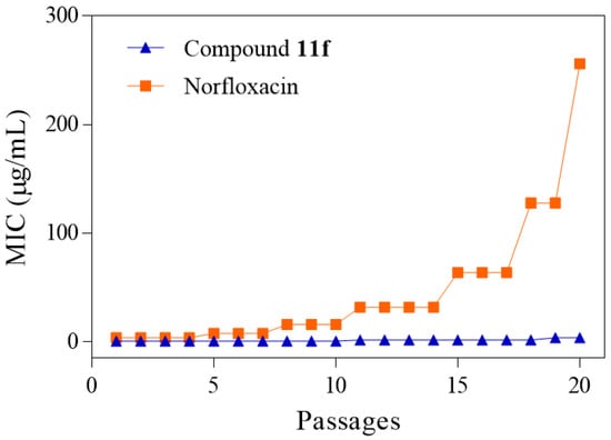 The prevalence of bacterial resistance is the primary cause for the decline of available antibiotics and the initial impetus for the development of new antibacterial chemical entities [,,,]. Therefore, it is necessary to investigate whether the most promising PHCI 11f could spark rapid bacterial resistance. A serial passaging resistance study of derivative 11f against P. aeruginosa 27,853 strain was conducted and norfloxacin was applied as a positive control. Over the course of 20 days, the resistance level of P. aeruginosa 27,853 (Figure 3) for coumarin-derived 11f almost remained constant, while the resistance for norfloxacin gradually increased after the fifth passage, indicating that the strain was difficult to develop resistance to 11f.