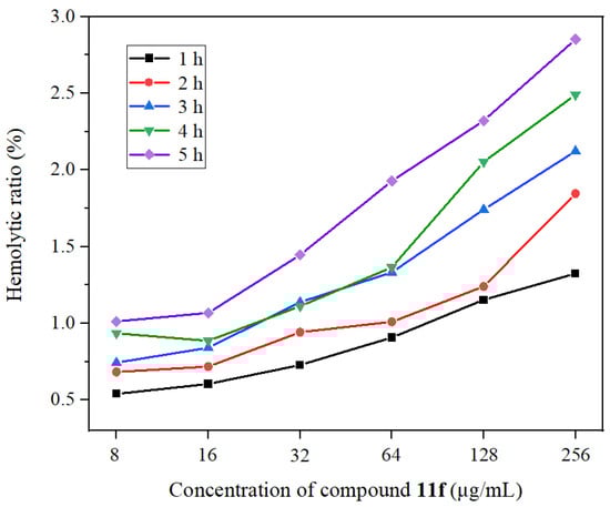 The safety of drug candidates on mammalian cells is an important indicator to evaluate their clinical application potential [,,]. Herein, a hemolytic assay of 4-chlorobenzyl PHCI 11f towards human red blood cells (RBCs) was performed with physiological saline as a negative control and 1% Triton as a positive control [,]. As displayed in Figure 4, after incubating with 11f at increasing concentrations (8, 16, 32, 64, 128, and 256 μg/mL) for different times, the hemolytic rates were all lower than the highest international standard of 5%, revealing the relative biosafety of PHCI 11f to RBCs, even at high antibacterial concentrations. This manifested that 11f could selectively act on bacteria whilst having little damage to RBCs, which might be assigned to the difference in the content and electric properties of membrane phospholipids between bacteria and mammalian cells.