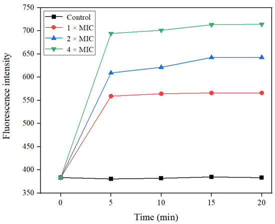 The stability of the bacterial transmembrane potential is closely connected to normal life activities. DiSC3(5) fluorescent dye can be absorbed by polarized cells and gathered in the phospholipid bilayer accompanied by fluorescence self-quenching. Once the membrane potential is disturbed, the dyes are released from cells and give off strong fluorescence, providing a manner to measure bacterial membrane potential [,,]. As exhibited in Figure 7, after incubation with different concentrations of coumarin 11f, the fluorescence intensity presented a dose-dependent increase, indicating that PHCI 11f could obviously dissipate the membrane potential and lead to membrane depolarization.