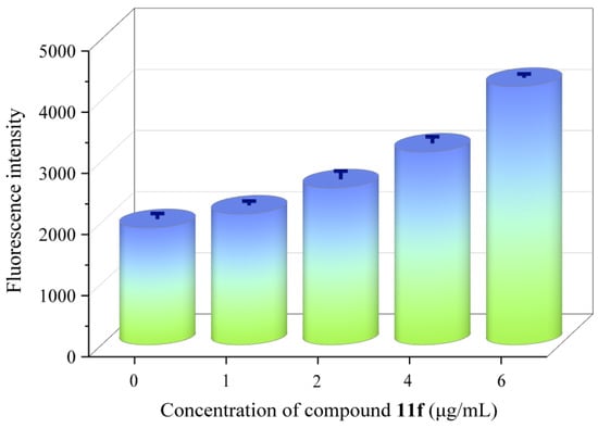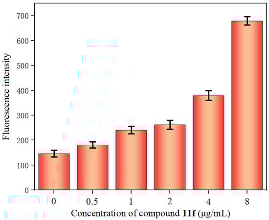 The inner membrane is also an effective permeability barrier for Gram-negative bacteria. To explore the effect of derivative 11f on the P. aeruginosa 27,853 inner membrane, propidium iodide (PI), a common penetrable dye that could penetrate the compromised membrane and combine with intracellular nucleic acid to emit intense red fluorescence, was applied to detect the inner membrane permeability [,,]. As depicted in Figure 6, the fluorescence intensity gradually raised upon the treatment of increasing amounts of 11f, especially at 8 μg/mL, where the fluorescence change was the most remarkable. This performance was consistent with that of the outer membrane, implicating that PHCI 11f could effectively enhance P. aeruginosa 27,853 membrane permeability from outer membrane to the inner membrane.