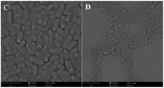 The SEM images of P. aeruginosa 27,853 without treatment (A) and treated with 4-chlorobenzyl 11f at 2 μg/mL for 3 h (B), 6 h (C), and 12 h (D).