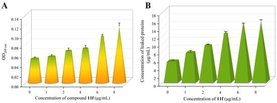 The damage of cell membrane integrity is predicted to result in the effusion of intracellular crucial biological macromolecules, such as nucleic acids and proteins [,,]. Nucleic acids have a characteristic ultraviolet absorption at 260 nm, so the outflow of nucleic acids can be determined by measuring the optical density value of 260 nm [,]. As expected, the OD260 values of leaked nucleic acids increased significantly from 0.049 to 0.115 in response to treatment of PHCI 11f at 8 μg/mL (Figure 9A). Meanwhile, a similar phenomenon was also observed in the amount of leaked proteins. The leakage of intracellular proteins from P. aeruginosa 27,853 after being treated with 11f at 8 μg/mL was enhanced by three-fold compared to the untreated group (Figure 9B). These results further indicated that PHCI 11f destroyed bacterial membrane, inducing the leakage of cellular components.