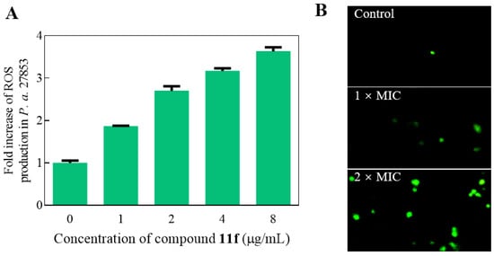 The cellular ROS production (A) and fluorescent images (B) of P. aeruginosa 27,853 exposed to different concentrations of compound 11f. Scale bar for all fluorescent images was 100 μm.