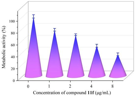 Given that membrane destruction and oxidative damage might affect the bacterial vital biological functions, such as metabolism, alamar blue (resazurin) as an indicator was utilized to detect the metabolic activities of bacterial cells. The detection is based on the capacity of metabolically active cells to transform nonfluorescent resazurin into pink fluorescent resofurin [,]. In Figure 11, the metabolic vitality of P. aeruginosa 27,853 cells was evidently inhibited upon PHCI 11f exposure, especially at 8 μg/mL, where the percentage declined to 36%. This result demonstrated that PHCI 11f could render bacteria functionally abnormal, leading to metabolic disorder and loss of cell viability.