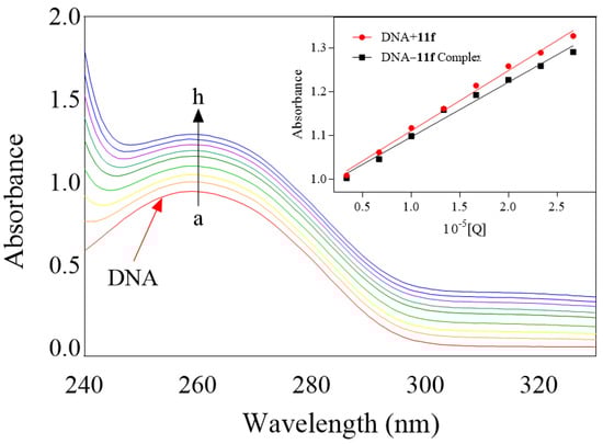 The absorption spectra of DNA in the presence of coumarin indolylcyanoenone 11f. c(DNA) = 7.1 × 10−5 mol·L−1, c(11f)/(10−5 mol·L−1), a–h: 0–1.333 (increment: 0.167). Inset: Absorption comparison at 260 nm between the DNA–11f complex and the simple addition of DNA alone alone 11f alone.