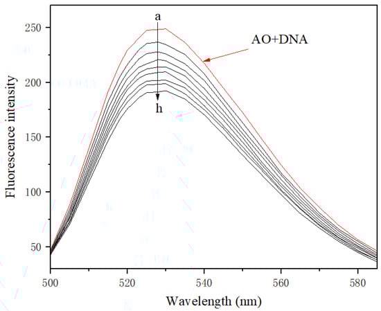 Fluorescence variation of DNA–AO system with increased coumarin 11f. c(DNA) = 7.1 × 10−5 mol·L−1, c(11f)/(10−5 mol·L−1), a–h: 0–1.333 (increment: 0.167).