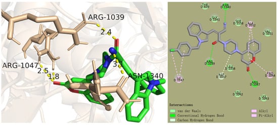 Bacterial DNA gyrase is a well-known target for coumarin-based antibiotics. Molecular docking simulation was performed to clearly clarify the binding behavior between coumarin-derived 11f and DNA gyrase. As seen from Figure 14, the oxygen atom of the carbonyl group on the coumarin core could interact with residue ARG-1047 by hydrogen bonding. Moreover, alkyl or π-alkyl interactions were also found between the coumarin ring and residues ALA-1032 and PRO-1044. The oxygen atom of enone and the nitrogen atom of the cyano group could form hydrogen bonds with ARG-1039 and ASN-1340, respectively. The substituted 4-chlorobenzyl group also generated alkyl or π-alkyl effects with ILE-1147. The above supramolecular action modes might be helpful to stabilize the 11f–enzyme complex, affecting the normal function of DNA gyrase.