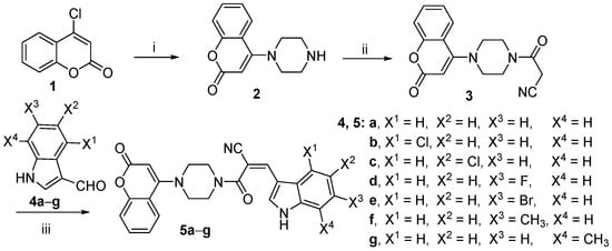 Synthesis of N-unsubstituted piperazine hybridized coumarin indolylcyanoenones 5a–g. Reagents and conditions: (i) EtOH, piperazine, rt; (ii) DMF, cyanoacetic acid, HBTU, DIPEA, rt; (iii) EtOH, piperidine, 4a–g, 80 °C.