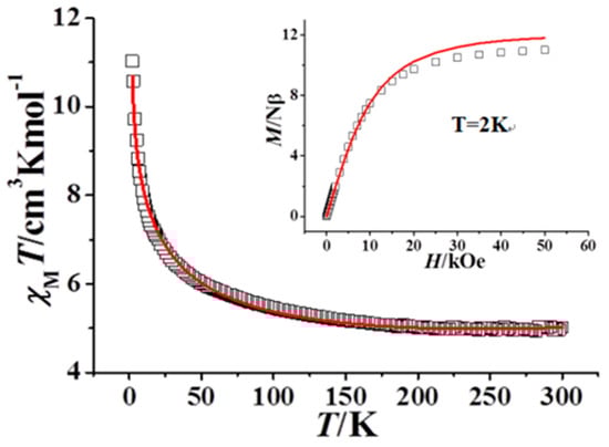 χMT vs. T and (insert) M vs. H behaviors for complex 1. The red line is the best fit (see text).