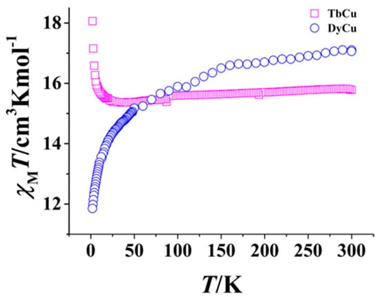 χMT vs. T plots for complexes 3 (TbCu) and 4 (DyCu).