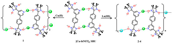 [Cu-biNIT]2 SBU and its involvement in the formation of complexes 1 and 2–4.