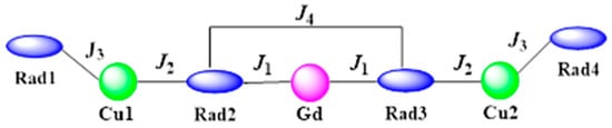 As mentioned above, the magnetic exchange interaction between CuII and the NIT radical through the phenyl and pyridine rings can be ignored. Thus, the magnetic properties of 2 mainly result from the exchange-coupled [Rad1-Cu1-Rad2-Gd-Rad3-Cu2-Rad4] spin sequence. The pertinent paths for magnetic interactions are shown in Scheme 4, where J1 accounts for the Gd-NO exchange, J2 accounts for the Cu-NOaxial interaction, J3 accounts for the NO---Cu coupling via the pyridine ring, and J4 accounts for the next-neighbor interaction between the two NO units coordinated to the GdIII ion.