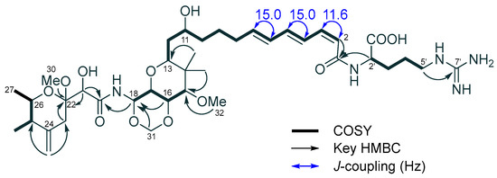 The distinct difference between 1 and 3 was observed in the side chain, as observed by the downfield-shifted signals for the polyene protons (H-2 to H-7). The overlapping signals of H-2 and H-3 were assigned based on the coupling constants of J2,3 (11.3 Hz), J4,5 (15.0 Hz) and J6,7 (15.0 Hz), which were obtained by processing data using a modified apodization function [16] (Figure 1). The geometry of the double bond between H-2 and H-3 in 1 was deduced as cis, confirming 2Z-onnamide A as 1.