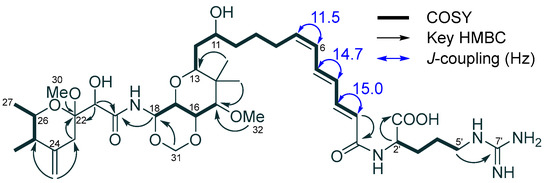 COSY, key HMBC cross-peaks and coupling constants of 6Z-onnamide A (2).
