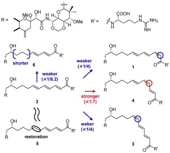 Compounds 1–6 showed significant cytotoxicity against HeLa cells with IC50 values of 38–540 nM (Table 3). SARs study using HeLa cells revealed that compound 5 with the reduced C21–C22 single bond is as potent as onnamide A (3), whereas 6 with a shorter side chain showed weaker activity (×1/8.2). The positions of the cis-trans isomerism in the side chains of onnamides also affects cytotoxicity: compound 4 was 1.7-fold more potent than 3, whereas 1 and 2 were 2.5-fold less cytotoxic than 3 (Figure 3).