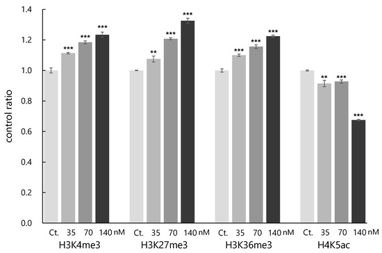 Subsequently, the effects on histone modifications by onnamide A (3) were investigated using 16 monoclonal antibodies specific to each histone modification (Figure S18). The results revealed that 3 altered 13 histone modifications at concentrations of 70 and 140 nM, that are higher than the IC50 value (66 nM). Compound 3 enhanced the levels of trimethylated histone H3 lysine 4, 27 and 36 (H3K4me3, H3K27me3 and H3K36me3) and reduced the level of acetylated H4 lysine 5 (H4K5ac) at the lowest concentration (35 nM, Figure 4). All four histone modifications are related to cytotoxicity [19,20,21,22,23,24]. As H4K5ac is associated with DNA replication in the cell cycle, its decrease is consistent with the cell cycle arrest induced by 3 [14].