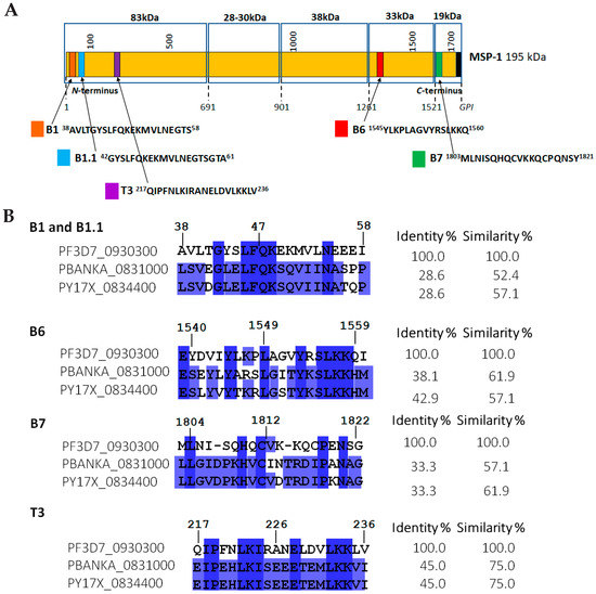 Epitope-peptide selection from the MSP1 structure. (A) Four B and one T potential epitopes are located at N- and C-MSP1 termini herein coded B1, B1.1, B6, B7, and T3. (B) Structure homology studies show the high identity and similarity of the MSP1 fragments among human and rodent Plasmodium spp. Color code for sequence identity: dark blue higher than 80%, mid blue higher than 60%, light blue higher than 40%, and white for no identity.