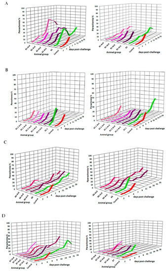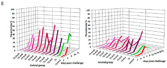 Parasitemia levels were followed by using Giemsa staining of fine blood smears and examined at 1000× magnification. Parasite-infected red blood cell (iRBC) percentages were analyzed by recounting at least 9000 RBCs to establish the evolution of parasitemia in all animal groups. Animal care was carried out in agreement with international guidelines [51]. Animals subjected to invasive procedures were treated under anesthetic or analgesic conditions as ethically recommended.