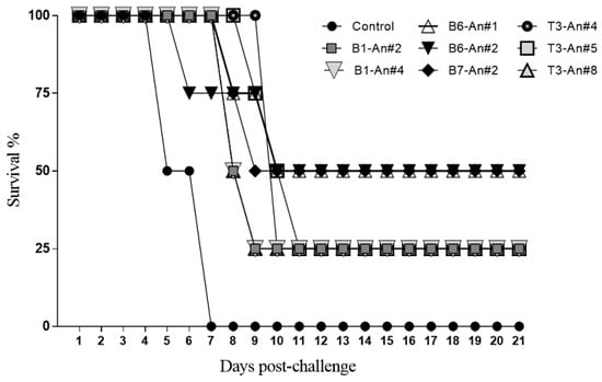 Follow-up of vaccine-challenged mice on the severity of the disease caused by Plasmodium spp. showed that animals of the control groups normally died within the first 7 days after being challenged in agreement with previous observations [16]. On the other hand, some groups of animals immunized with MSP1 peptidomimetics revealed survival profiles between 25% and 50% (Figure 3).